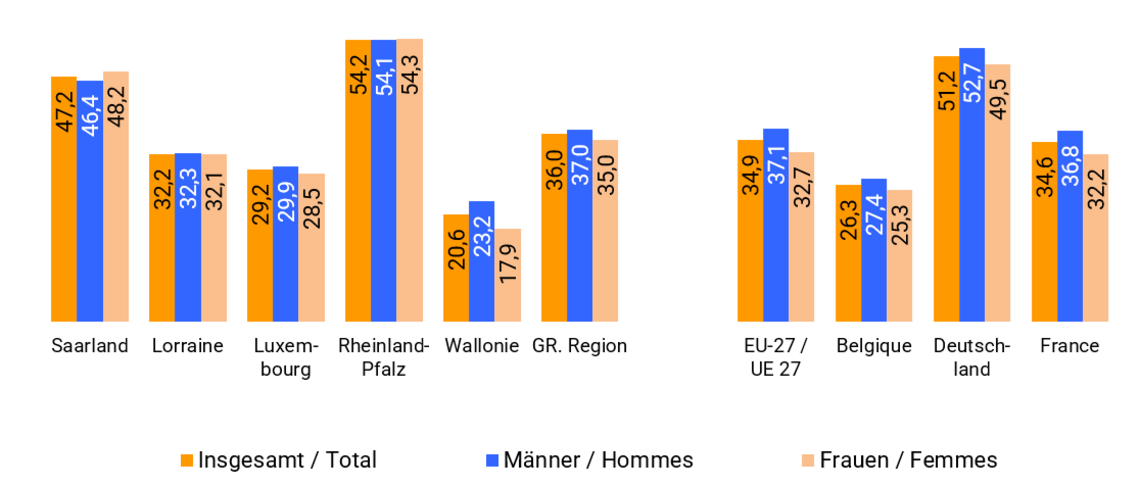 Darüber hinaus variieren die Beschäftigungsquoten junger Menschen innerhalb der Großregion stark zwischen den einzelnen Teilregionen. Rheinland-Pfalz und das Saarland weisen mit 54,2 % bzw. 47,2 % die höchsten Quoten auf. Die anderen Teilregionen liegen unter dem Durchschnitt der Großregion (36%). Während die wirtschaftliche Lage der verschiedenen Regionen logischerweise einen Einfluss auf die Beschäftigungsquote junger Menschen haben kann, sind die Unterschiede in den Quoten auch weitgehend auf Unterschiede in den Bildungs- und Ausbildungssystemen oder auf die unterschiedliche Behandlung von Nebenjobs von Schülern und Studenten zurückzuführen.