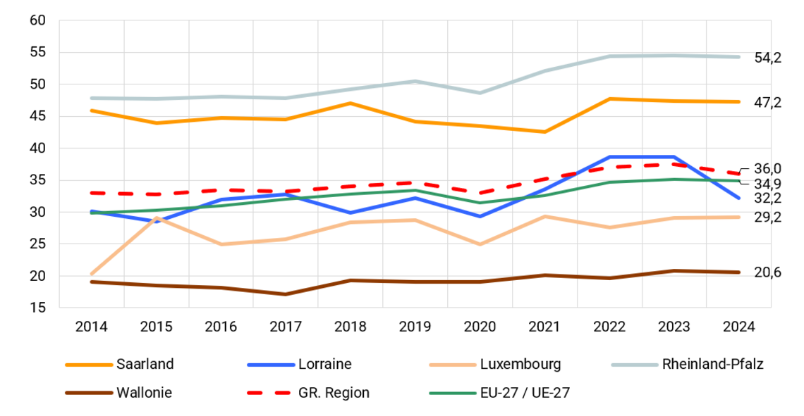 Die Beschäftigungsquote entspricht dem Anteil der Erwerbstätigen an der Gesamtbevölkerung einer bestimmten Altersgruppe. In der Großregion lag die Beschäftigungsquote der 15- bis 24-Jährigen im Jahr 2024 bei 36,0 % und war damit 3,0 Prozentpunkte höher als 2014. Im Vergleich zur Altersgruppe der 20- bis 64-Jährigen, deren Beschäftigungsquote im Jahr 2024 bei 74,7 % lag, ist die Beschäftigungsquote junger Menschen deutlich niedriger. Dieser Unterschied ist auch in allen Teilregionen zu beobachten, allerdings mit mehr oder weniger ausgeprägten Abweichungen.