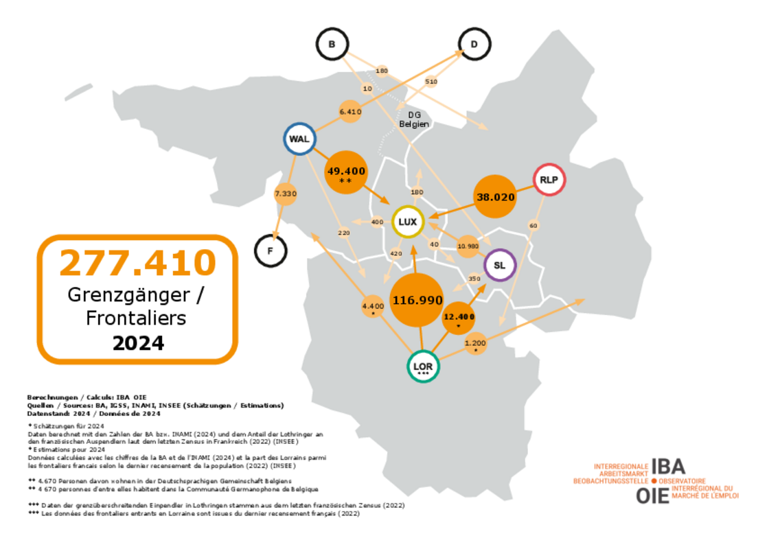 Im Jahr 2024 verzeichnete die Großregion etwa 276.360 grenzüberschreitende Einpendler, von denen über 80 % nach Luxemburg pendeln. Die Wallonie nimmt einen Anteil von etwa 12 % auf, in das Saarland pendeln 5 % und nach Rheinland-Pfalz sind es 1,5 %. Zwischen 2023 und 2024 hat die Zahl der Einpendler in die Großregion um knapp 2.000 Personen bzw. um 0,7 % zugenommen. Dieser Anstieg fällt so gering aus wie zuletzt im ersten Jahr der Gesundheitskrise zwischen 2019 und 2020, als die Zahl lediglich um 1.912 Personen stieg.