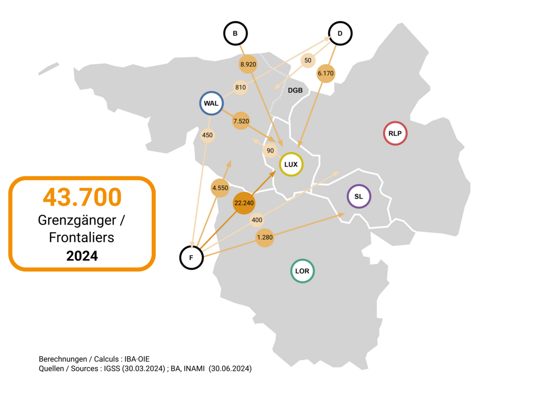 En 2024, la Grande Région comptait environ 276 360 frontaliers salariés (frontaliers entrants). 16 % d’entre eux – soit environ 43 700 personnes – avaient moins de 30 ans. En 2024, le Grand-Duché de Luxembourg était de loin la destination principale des jeunes frontaliers : près de 85 % d’entre eux y travaillaient.