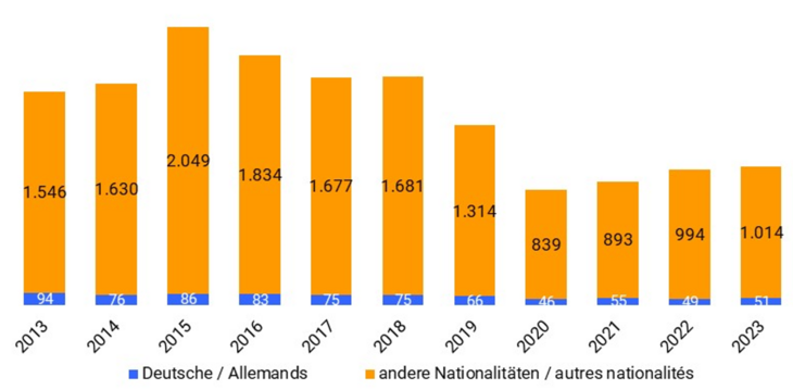 Der Großteil des Anstiegs der Zahl französischer Grenzgänger zwischen 2022 und 2023 um 230 Personen ist auf die positiven Veränderungen im verarbeitenden Gewerbe (+1,5 % sprich +78 Personen) zurückzuführen. Erwähnenswert sind auch die Bereiche „Freiberufliche, wissenschaftliche und technische Dienstleistungen“ (+46 Personen oder +10,9 %) sowie die „öffentliche Verwaltung, Verteidigung, Sozialversicherung“ (+32 Personen oder +15,2%).
